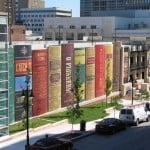 Each book measuring 25 ft reflects the reading interests of the Kansas community at the time the library was built.