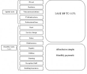 Pay for what you use - In a serviced office you only pay for the space you actually occupy, space for corridors, reception areas, IT rooms, break out/internet areas, kitchen space, comfort rooms is NOT charged for. However in a conventional leasehold office you pay rent , rates and service charge on the whole space whether you use it or not. Also you only pay for occasionally used space such as meeting rooms as and when you use them as opposed to paying rent, rates and service charge on this space the whole year round.