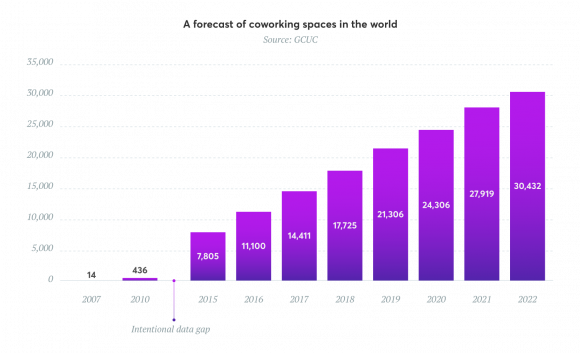 Experts at GCUC predict that there will be more than 30,000 coworking spaces globally by 2022. This represents 72% growth since 2018. The upward trend continues at pace and it is predicted that 30% of corporate real estate will be flexible office space by 2030.