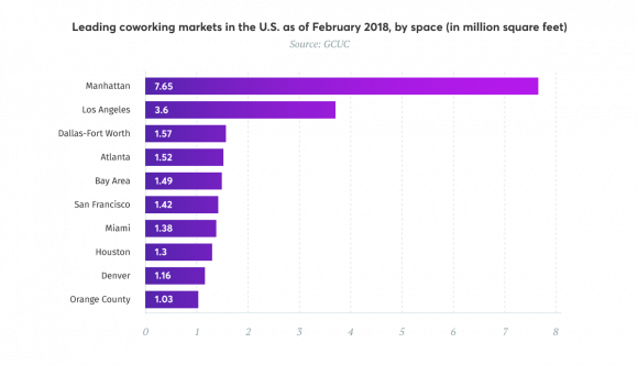 Here are the 10 leading US markets, each with over 1 million square feet of coworking space.