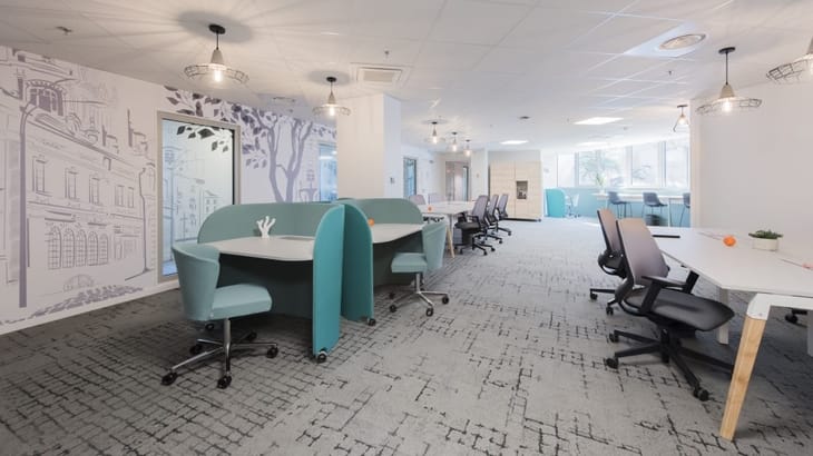 The workspace spans around 1 600 m² of modern, modular areas including private offices, a coworking zone with private pods, up to 9 meeting rooms and professional services such as high-speed Wi-Fi, reception support and administrative assistance, designed to support productivity and networking.