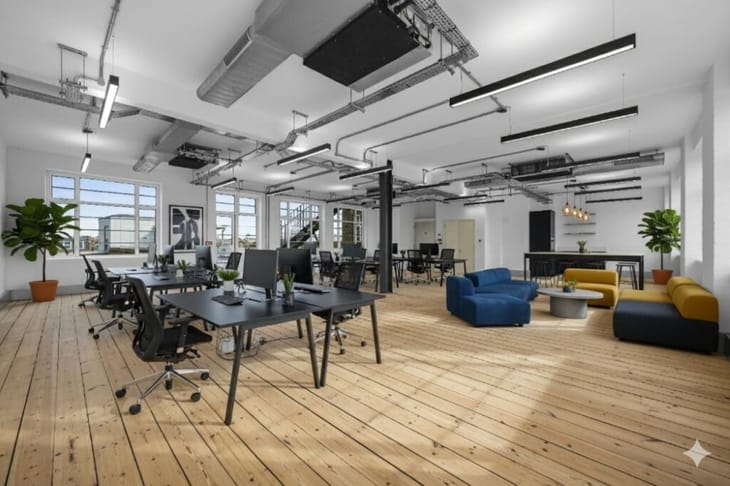 The building offers flexible office floors with open-plan layouts, wooden flooring, high ceilings, and large windows that provide strong natural daylight. Amenities include air conditioning, a passenger lift, bicycle storage, shower facilities, and breakout areas, creating a comfortable and practical workspace for businesses.