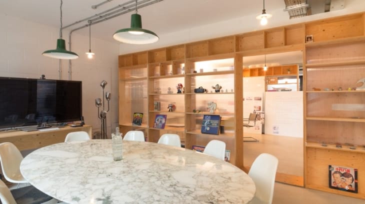The workspace features an open-plan office layout with high ceilings, exposed concrete finishes, and large windows that provide strong natural light. Amenities include meeting rooms, air conditioning, bike racks, and 24-hour access. The offices are designed in a modern industrial style, creating a flexible and collaborative environment for growing teams and creative businesses.