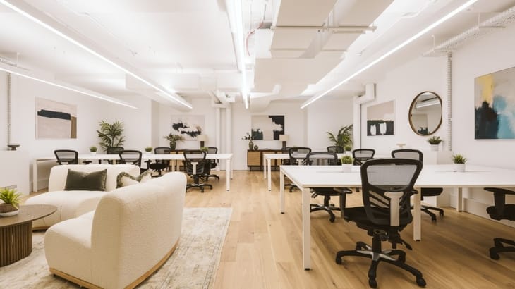 The space at 18 Clerkenwell Close is part of a carefully redesigned Victorian building in central Farringdon that blends historic character with modern finishes, offering quality workspace with features such as air conditioning, fibre connectivity, end-of-trip facilities (bike storage and showers), and excellent natural light overlooking St. James Church Garden.