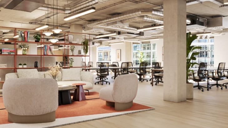 The building offers design-led office accommodation with flexible floor plates, typically ranging from about 3,181 to 7,474 sq ft. Floors are usually delivered fully fitted with workstations, meeting rooms, breakout areas, and kitchen facilities, supported by exposed structural features and high ceilings that create a contemporary workspace environment. The building has approximately seven storeys and around 23,000 sq ft of total office space.