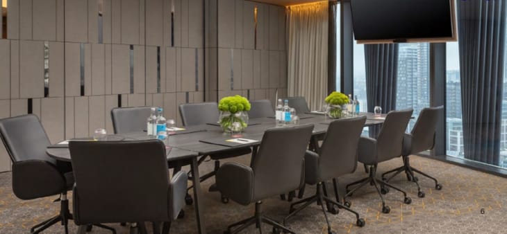 The tower includes hotel accommodation, creative workspaces, meeting and event areas, and leisure facilities. Amenities include a screening room, spa, gym, indoor swimming pool, and multiple dining venues such as restaurants, cafés, and cocktail bars. Several floors provide co-working and flexible workspace, along with panoramic event spaces on the upper levels offering skyline views of London.
