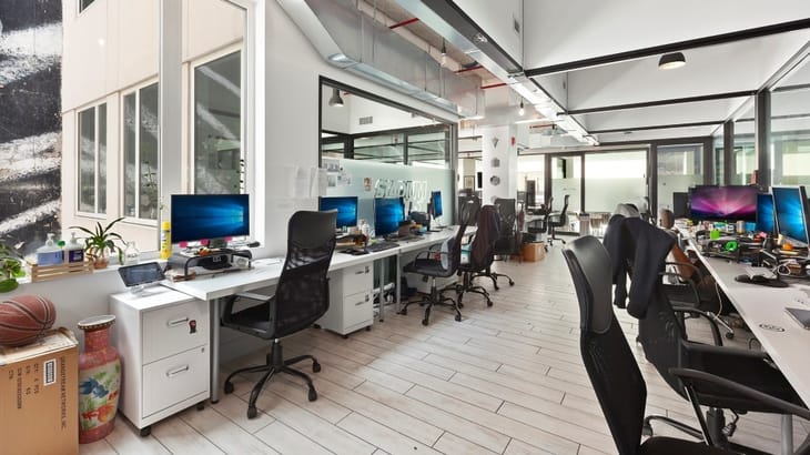 The property spans roughly 37,000 sq ft across seven stories, offering a mix of private offices, coworking desks and event areas that can be adapted to different team sizes. Interiors feature floor-to-ceiling windows, modular layouts, high-speed internet, cleaning and mail services, and access to outdoor rooftop and courtyard spaces, making it flexible for professional and creative use.