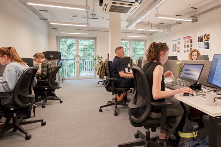The building offers flexible co-working and office environments including hot desks, dedicated desks, and private offices, along with a large event space for conferences and networking. Facilities include high-speed broadband, meeting rooms, breakout areas, café services, and business support resources, creating a collaborative and tech-focused workspace.